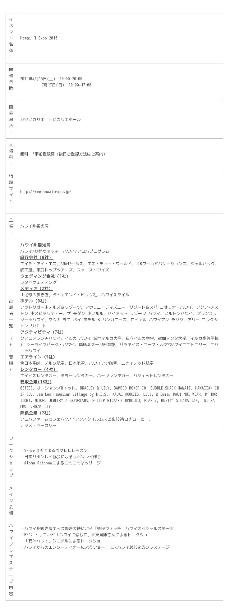 なお、イベント特設サイト(http://www.hawaiiexpo.jp/)では、出展企業詳細、タイムスケジュールなど随時更新していきます。
