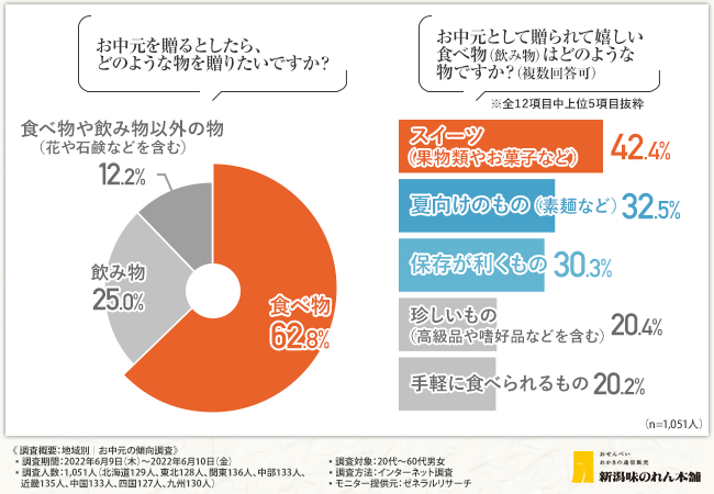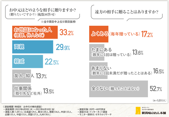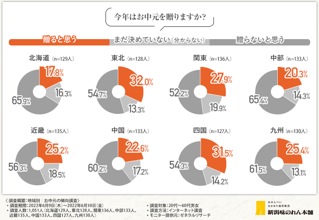 そこで今回、新潟の工場直送・国産米100%のおせんべい・おかきのメーカー株式会社新潟味のれん本舗(https://www.ajinoren.co.jp/)は、20代~60代男女を対象に、地域別|お中元の傾向調査を実施しました。