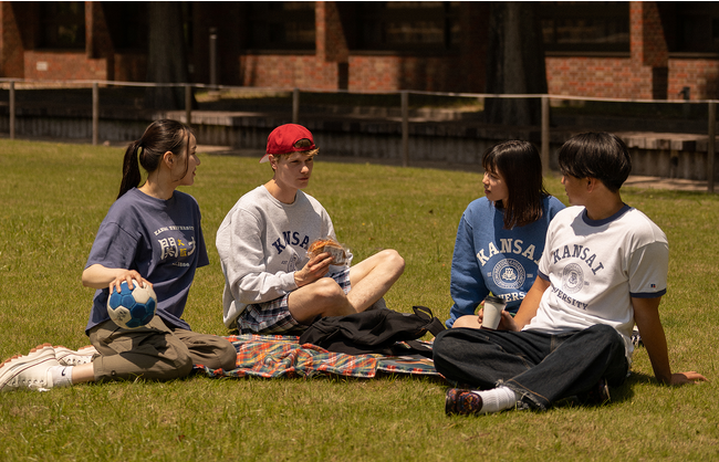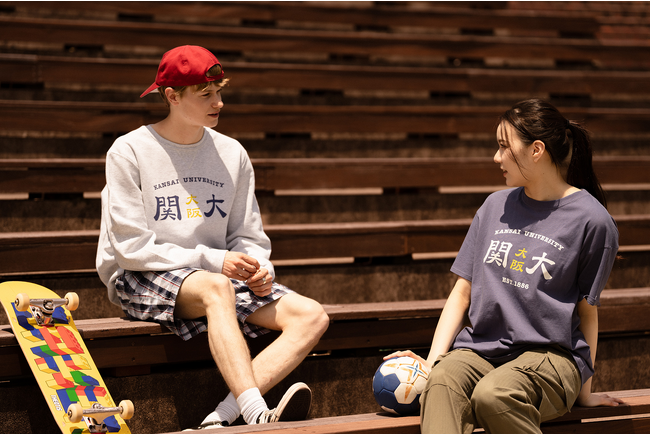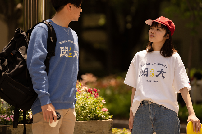 関西大学のスウェットおよびTシャツのデザインは、本学のスクールカラーである「紫紺」を基調とした王道のカレッジロゴデザインと、大阪で生まれ育まれ、全てのキャンパスが大阪にあることから、胸元に「大阪の大学」と一目でわかる「大阪」の文字を入れたとがったデザインの2種を展開。いずれもアメリカの歴史あるアスレティックウェアブランド「Russell Athletic」とのコラボアイテムです(各2色)。また、商品紹介用のルック画像は、本学千里山キャンパスにて撮影を行い、在学生の4名がモデルを務めました。