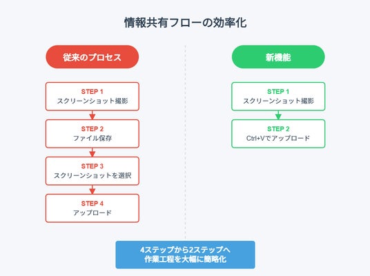 従来のシステムでは、スクリーンショットを活用した情報共有において、「撮影→ローカル保存→ファイル添付」という複数のステップが必要であり、ユーザーの業務効率を低下させる要因となっていました。この課題は、日々の業務で数十回にも及ぶスクリーンショット共有を行うユーザーにとって、大きな時間的損失を生んでいました。