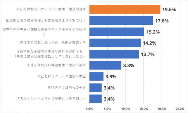 調査結果から、各企業の選考活動に影響が及びつつあり、対策を講じている企業が増えていることが判明。対策として、面接・面談業務をオンライン化することが、最上位となりました。時間や場所の制約のみならず、健康管理や衛生対策の観点でも、来社を伴わない面接活動の増加が見込まれます。