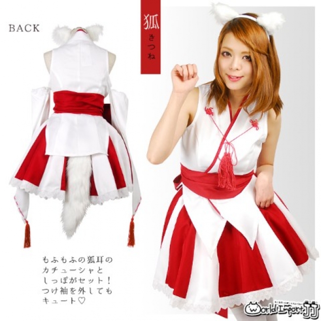 ホワイト×レッドの巫女カラーにファーで作ったシッポと耳付きカチューシャがセット。
