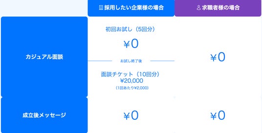 求職者側は無料で利用が可能。採用企業側はマッチング1名あたり2,000円となっています。従来の採用サービスと異なり、求職者と面談したうえで料金が発生するため、確実に求職者と接点を持てるという意味でコスパの良い採用活動が可能です。現在、ティザーサイト公開キャンペーンとして、事前に法人利用登録いただいた企業様へ初回お試し面談チケット5回分(10,000円相当)を無料プレゼント中です。