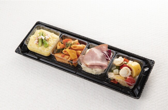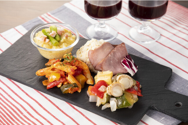 「イルキャンティ」監修の4種の前菜を詰め合わせました。バターフレーバーオイルとチキンブイヨンの効いた春らしいカルボナーラリゾット(一番左)、すりおろしにんにく、ホワイトペッパーが入ったイタリアンの定番ラタトゥイユペンネ、(左から二番目)、ローストビーフとマッシュポテトのサラダ(左から三番目)、ごろごろ野菜のマリネ(一番右)を合わせた季節を感じる春のアンティパストに仕上げました。