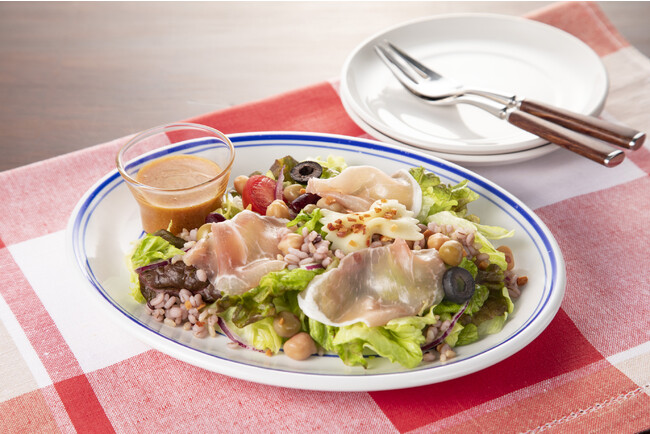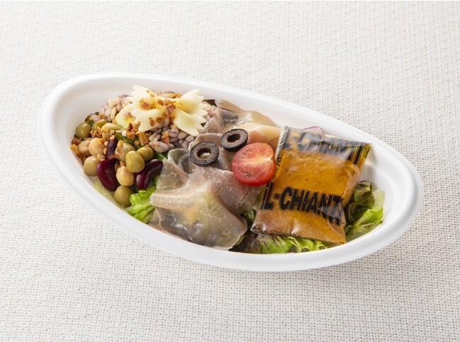 生ハム、雑穀、豆、パスタ、ナッツ等の12品目の食材を使った華やかな見た目と食感が楽しめるイタリアンサラダ。拘りの素材を独自の配合でブレンドした「イルキャンティ」秘伝のドレッシング入りで、素材の旨味を最大限に抽出した“旨味の塊”を味わえます。