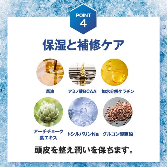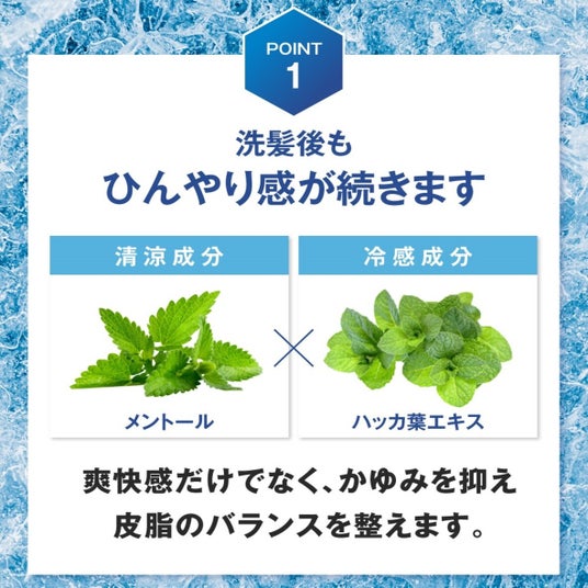 メントールとハッカ葉エキスを配合。スッキリ冷感クールシャンプーで、夏の湿気や汗、皮脂のべたつき、汚れをしっかり洗い流します。爽快感だけでなく、皮脂のバランスを整えることをサポートします。
