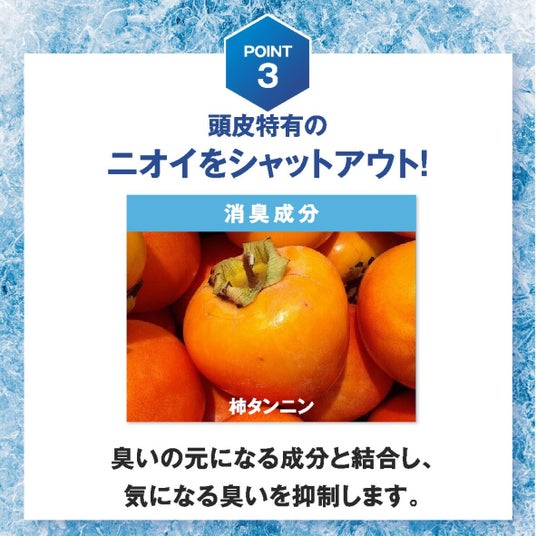 日本に古くから伝わる消臭への知恵袋的素材の成分である柿タンニンを配合し、夏の頭皮の気になるニオイを防ぎます。