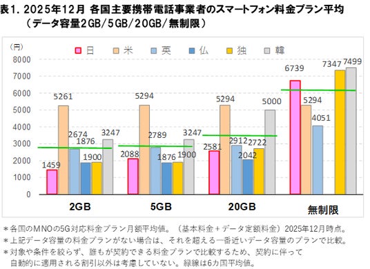 調査対象は日本、アメリカ、イギリス、フランス、ドイツ、韓国の 6 カ国の 主なMNO とし、各国のスマートフォン料金は2025年12月時点のものとした。