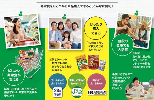 三和製作所では、防災カタログにおいて業界初の試み(※1)として、ほとんどの防災食を1つから購入できる新しいスタイルを2019年より採用しています。さらに、掲載の防災食は、栄養や保存性に優れているのはもちろん、味にこだわった、商品を厳選しています。