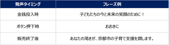 本自販機は、京都市子ども若者はぐくみ局はぐくみ創造推進室が実施する「京都市はぐくみ未来応援事業」に賛同し企画されたもので、本自販機の売上の一部は「京都市はぐくみ未来応援事業」へ寄付されます。また、金銭投入時・商品搬出時などには、オリジナル音声メッセージが流れる機能を搭載しており、本自販機をご利用される方々が「京都市子どもはぐくみ未来応援事業」に関心を持ち、地域の子ども・若者を応援するきっかけになることを期待しております。