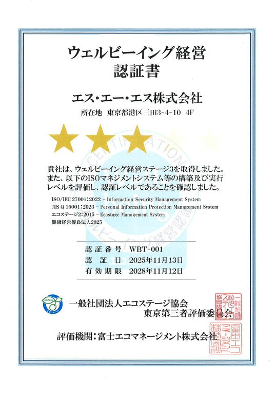社会に笑顔を実装するスマイルテック・カンパニーのエス・エー・エス株式会社(本社:東京都港区三田、代表取締役:青山 秀一、以下「当社」)は、一般社団法人エコステージ協会(評価機関:富士エコマネージメント株式会社)によるウェルビーイング経営認証ステージ3(以下、WB認証)を取得したことをお知らせいたします。認証番号:WBT-001(第1号)となります。