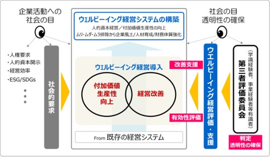 一般社団法人エコステージ協会が運営する「ウェルビーイング経営ステージ」は、ISO45001やISO30414などの国際規格を取り入れたマネジメントシステムを基盤に、社員とその家族の安全・安心・健康・幸福(Well-being)を経営の中心に据えた企業を段階的に評価する第三者認証制度です。認証取得の目的は単なる称号ではなく、PDCAサイクルに沿って組織の経営改善を促し、社員が長期的に活躍できる環境を整えることにあります。申請後は有資格の評価員が訪問調査や助言を行い、その結果を学識経験者等からなる独立した「第三者評価委員会」が審査し、妥当性が認められた場合にのみ認証が付与されます。