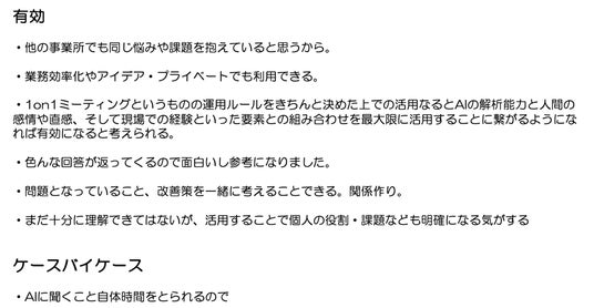 実施事項:毎月1on1ミーティングを設定し、ミーティングの前にスタッフは生成AIを活用し論点を整理した上で参加