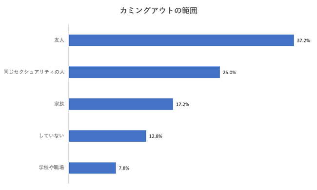 カミングアウトの範囲としては友人が37.2%、同じセクシュアリティが25.0%、家族が17.2%と身近な存在が大半を占めています。また先日の調査において、ゲイの方々の場合29.2%が誰にもカミングアウトできていませんでしたが、レズビアンの方々においては12.8%となっており、大きな差があることがわかりました。