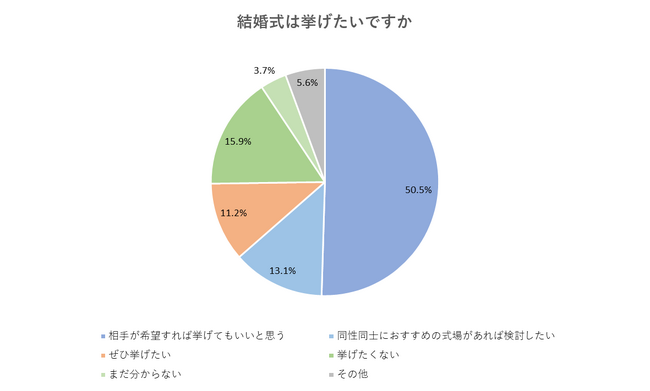 もっとも多かったのは、相手が希望すれば結婚式を挙げてもいいと思う(50.5%)となり、挙げたくない(15.9%)を大きく上回る結果となりました。