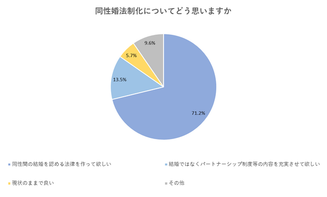続いて、今話題になっている同性婚の法制化についても聞いてみました。特になしと回答した方(約9%)を除いたものが以下のグラフです。