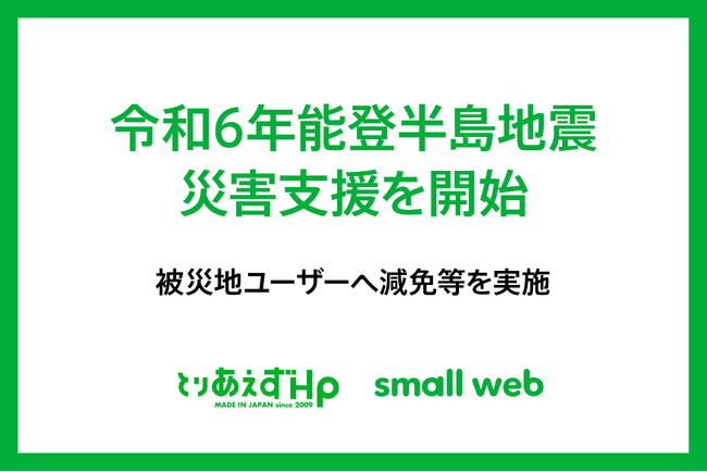スモールビジネス向けのホームページ作成ツール「とりあえずHP」(https://pr.toriaez.jp/)を提供する株式会社smallweb(本社:東京都渋谷区、代表取締役:佐野彰彦) は、2024年1月1日に石川県能登地方で発生した令和6年能登半島地震で被災されたユーザーを対象に、令和6年能登半島地震災害支援を開始したことをお知らせします。