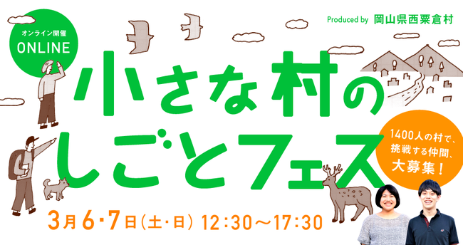 岡山県西粟倉村(村長:青木秀樹、以下西粟倉村)は、2021年3月6-7日(土日)にオンラインにて、村内のベンチャー企業12社の合同求人イベントを開催いたします(参加費無料)。2019年3月に大阪・心斎橋で開催した「小さな村のしごとフェス」から丸2年、今度はオンラインにて全国から参加できる形で帰ってきました。