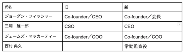 この決議に基づき、三浦 雄一郎(みうら ゆういちろう)が新たに取締役CEO に就任し、ジョーダン・フィッシャー(Jordan Fisher)は、代表取締役会長に就任いたします。