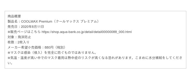 飛沫・ウイルスを99%カットし、繰り返し使える「COOLMAX Premium」は正式発売後180万枚を達成いたしました。(公式サイトhttps://shop.aqua-bank.co.jp/detail/detail00000088_000.html)