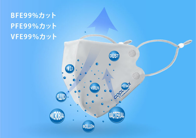 マスクのフィルター性能基準となる、「3つのマスク性能指標=捕集効率試験(BFE・PFE・VFE)」をクリアし、花粉や飛沫、PM2.5等「0.1μm単位」のウイルス、微粒子を99%カット。エビデスン取得。