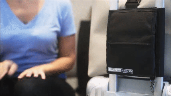 「Travel Bag Buddy」を使うことで、片手が空いて、旅の移動が楽になります。空港のセキュリティーの際も以下のGIF画像の通り、「Travel Bag Buddy」をセカンドバッグに取り付けたまま、簡単にスーツケースから外すことができます。セキュリティーチェックをパスした後、また簡単にスーツケースに取り付けることができます。