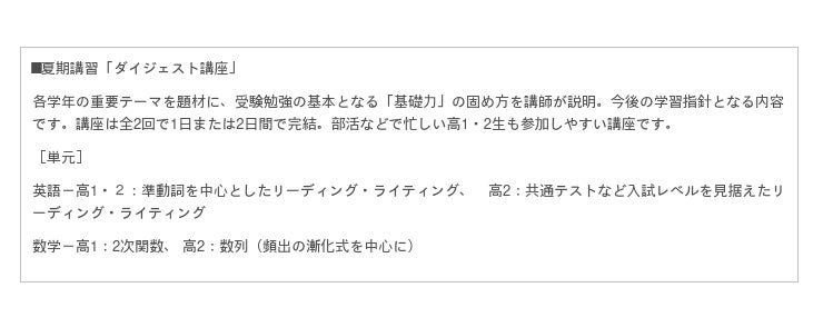 (1)夏期講習 ダイジェスト講座「夏から始める入試対策英語」・「夏から始める入試対策数学」