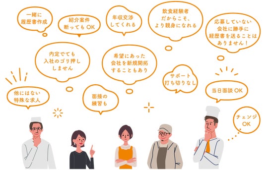 一番の特徴は、飲食業界出身のキャリアアドバイザーが在籍していること。現場を理解している経験者だからこそ出来る転職希望者に寄り添ったご提案とフレキシブルなサポートに大変ご好評の声をいただいております。