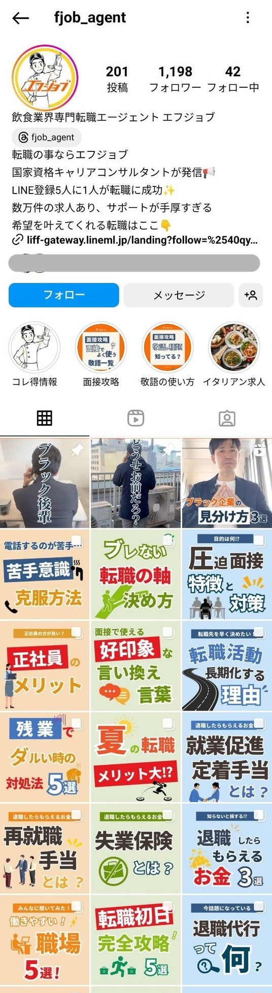 また、当社は時代のニーズに対応し、InstagramやTikTokなどのSNSを活用した情報発信も積極的に行っています。Instagramのリール動画は総再生回数50万回を超え、より多くの転職希望者様と飲食企業がマッチしやすい環境を提供しています。転職は頻繁に経験するものではないからこそ、不安や疑問が多く生まれます。転職希望者様の力が最大限発揮できるように、転職のコツから資料準備まで、様々な情報を発信しています。