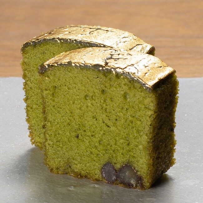 金箔が燦然と輝く豪華なケーキ。宇治抹茶を使用し、生地に大納言小豆を練りこみました。抹茶リキュールをほどよく効かせ、香り高く焼き上げた贅沢な焼菓子です。