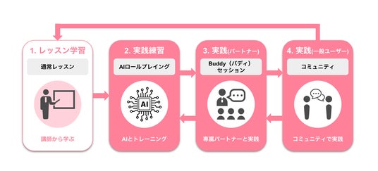 生徒一人ひとりに専属パートナー「Buddy」がつき、外国人との英会話の実践練習に取り組みます。この「Buddy」は、数百人単位のfondiの初心者ユーザーが、自信を持って英会話ができるまでの期間をサポートしてきた「英会話をリードするプロ」で、厳選されたfondiのコアユーザーでもあります。生徒は、この「Buddy」との信頼関係を構築することで心理的安全性が高い状態で、英会話の実践練習に挑戦できます。