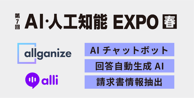 Allganize Japan株式会社(代表取締役:佐藤 康雄 、以下:「Allganize」)は、2023年5月10日(水)~ 5月12日(金)に東京ビッグサイトで開催される「第7回 AI・人工知能EXPO【春】」に出展いたします。展示ブースでは、既に多くの企業様に採用いただいている AIチャットボット「Alli(アリィ)」、回答自動生成 Powered by ChatGPT API、請求書情報抽出「Alli for Invoice」など、各種業務の最適化・コスト削減・DXを実現する先端の自然言語理解AIソリューションを展示いたします。