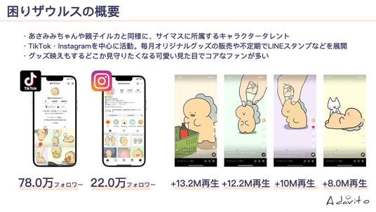 TikTokやInstagramなどを中心に活動しており、現在SNS総フォロワー100万人を突破し、オリジナルグッズやLINEスタンプを展開しているほか、ライセンス展開を2024年より開始しております。