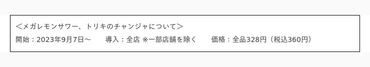 株式会社鳥貴族(本社:大阪市浪速区 代表取締役社長:江野澤暢男)が運営する全品328円均一(税込360円)の焼鳥屋「鳥貴族」は、2023年9月7日より、グランドメニューとして「メガレモンサワー」と「トリキのチャンジャ」の提供を開始いたします。