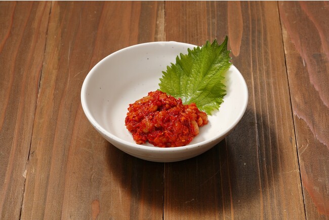 真鱈の胃を塩漬けにし、辛さと甘さがちょうど良い特製の甘辛ヤンニョムを加えた究極の珍味キムチです。厚みがありプリプリとした食感で、噛むごとに旨みが口に広がり食欲を刺激します。新鮮な海鮮の風味と甘辛な味付が相性抜群の一品です。