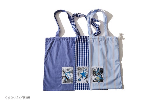 描き下ろしグラフィックを忠実に再現した織りネームを縫い付けたバッグ。作中でもキーとなる“ブルー”を各キャラクターごとに使用しています。A4サイズも余裕で入ります。ドローストリングデザインなので、巾着の機能も。