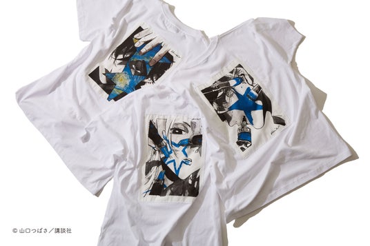 山口つばさ先生によるコンバーストウキョウのために描き下ろしたグラフィックを使用したTシャツ。キャンバスに見立てた生地にグラフィックをプリントし、背面に縫い付けました。胸元には各キャラクターのサインも印字されています。