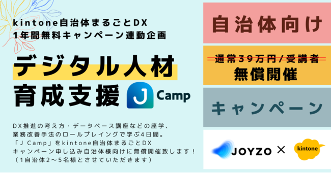 株式会社ジョイゾー(本社:東京都江東区、代表取締役社長:四宮 靖隆、以下 ジョイゾー)は、サイボウズ株式会社(本社:東京都中央区、代表取締役社長:青野 慶久、以下 サイボウズ)が4月より申込みを開始した「全国の自治体まるごとDXキントーン1年間無料キャンペーン」の対象となる自治体に向けデジタル人材育成サービス「J Camp」を無償提供させていただくことをお知らせいたします。