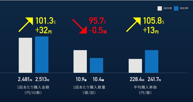 1回あたり購入金額は32円増加しています(前年比101.3%)が、1回あたり購入数量は0.5個(前年比95.7%)減少しています。平均購入単価が13円増加( 前年比105.8%)していることが、購入金額の増加につながっています。