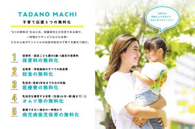 「ただのまち加西」として展開している「子育て応援5つの無料化」をはじめとし