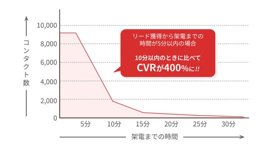 5分以内の架電は10分以内の架電に比べ、4倍も見込み顧客に繋がりやすいというデータがあります。見込み顧客がアクションを起こしたばかりで、自社の商品・サービスに対する印象が強いためです。