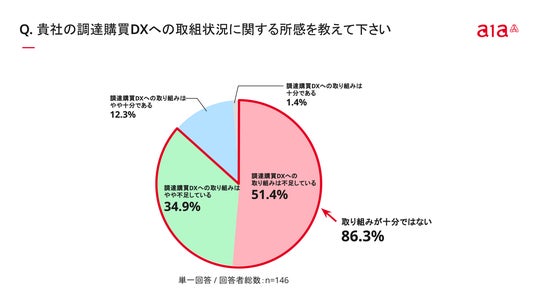 「不足している」「やや不足している」を合わせると、回答者の86.3%が調達購買DXへの取り組みが不足していると回答。
