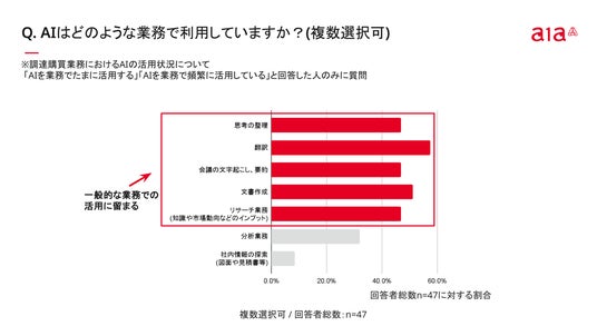 調達購買業務でAIを活用している回答者は「たまに活用する(1ヶ月に1回以上)」と「頻繁に活用している(1日1回以上)」と合わせて32.2%。しかし、その活用方法は「思考の整理」「翻訳」「会議の文字起こし、要約」「文書作成」など、一般的な業務での活用にとどまっており、調達購買そのものにおけるAI活用には至っていない。