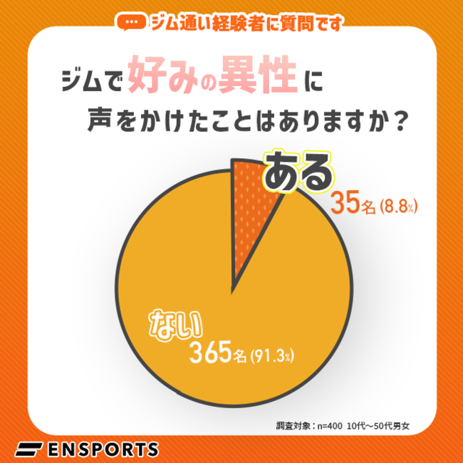 「ジムで好みの異性に声をかけたことはありますか?」という質問に対し、「ある」と回答したジム通い経験者は全体の8.8%に。ジムと出会いの実態とは? (https://www.ensports.com/magazine/meet-at-the-gym)
