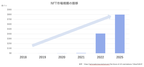 スマートコントラクト企業のAntier Solutions社のレポートによると、デジタル世界とリアル世界が融合化が進むにつれ、NFTの市場規模は年々増加しており、2022年は「350億ドル(約4兆円)」2025年に「800億ドル(約9兆1000億円)」になると予測されています。
