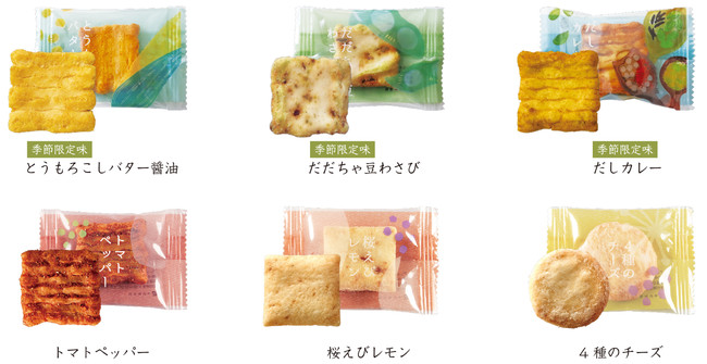 上記の季節限定の3種類の味のほか、通年商品から「トマトペッパー」、「桜えびレモン」、「4種のチーズ」を詰め合わせしました。