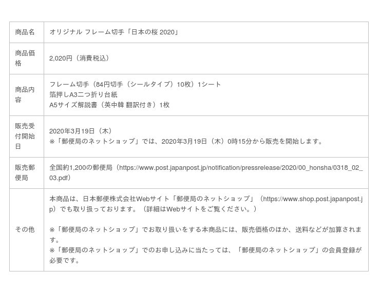 日本郵便株式会社(東京都千代田区、代表取締役社長 衣川 和秀)は、弘前公園の西濠の桜など、各地の桜を題材にしたオリジナル フレーム切手「日本の桜 2020」を、2020年3月19日(木)から別添の約1,200の郵便局および「郵便局のネットショップ」で販売します。