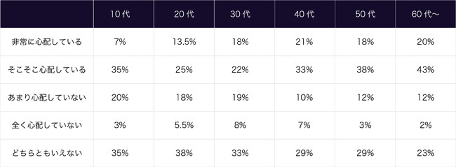 年代別に見た場合、プライバシーについて心配している割合は10代から30代が40%前後、40代以上は50%以上心配しているなかで、10代で非常に心配していると回答した人は7%にとどまることから、10代のプライバシーに対する意識は他の世代に比べていくらかライトな傾向にあると思われます。