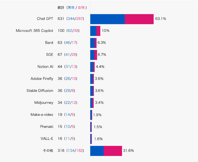 「Chat GPT」が最も認知度が高く、63.1%の人々が知っていると答えています。この結果から、OpenAIのChat GPTは生成AI分野では確実に認知を広げているといえます。