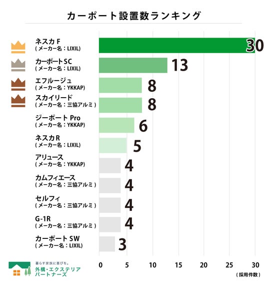 戸建て物件の外構・エクステリア工事の見積もりサイト「外構・エクステリアパートナーズ」を運営する株式会社ソーラーパートナーズ(本社:東京都新宿区、代表取締役:中嶋明洋)は、2024年1月1日から12月31日にかけて「外構・エクステリアパートナーズ」を通じたカーポート設置件数100件をもとにランキング形式で人気を可視化しました。